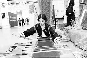 2021年5月,在第六屆全國大學(xué)生藝術(shù)展演活動(dòng)現(xiàn)場,海南師范大學(xué)學(xué)生展示黎族腰織機(jī)織錦技藝。第六屆全國大學(xué)生藝術(shù)展演活動(dòng)組委會供圖