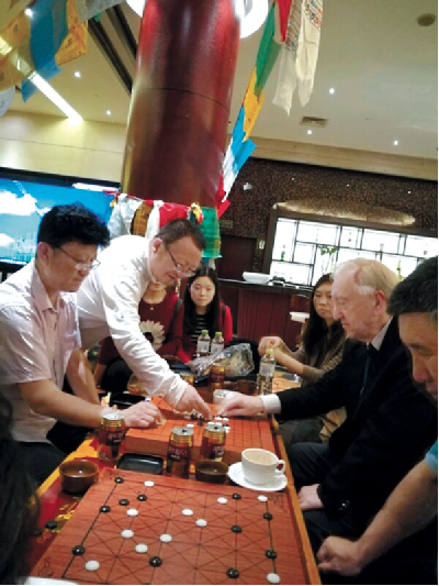 阿旺邊巴(左一)與外國(guó)藏棋研究學(xué)者交流藏棋文化。