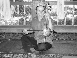 剛下車,就聽見平房里傳來了蒼涼、沙啞、如泣如訴的琴聲和悠揚(yáng)的歌聲。這就是艾捷克的聲音嗎?簡(jiǎn)直叫人心顫!我感嘆著,回頭問同行的翻譯薩達(dá)提·瓦依提。他仔細(xì)聽了聽,笑道:“這是艾捷克演奏的《青牡丹夏爾瓦努》!”“難怪這么深情婉轉(zhuǎn)?!蔽一腥淮笪?。