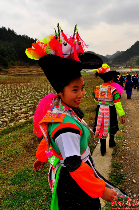 跳洞還有一項(xiàng)職能就是聯(lián)誼。正月期間,遠(yuǎn)近的苗家人都聚集在一個(gè)個(gè)有“洞”的村寨,一個(gè)“洞”跳一天舞,親戚朋友之間也借機(jī)聯(lián)絡(luò)感情。而對(duì)于苗族青年男女來說,“跳洞”則是一個(gè)相親的好機(jī)會(huì),通過跳洞相識(shí)、熟悉、相戀、成婚……杉坪村的家庭基本都是由跳洞開始而后組成的。
