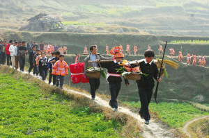 過去,如果新婚夫妻兩家相距較遠,那么新郎新娘整天甚至兩三天都要在路上行走。不過,姑娘、小伙兒收獲了甜蜜的愛情,這點付出也是值得的?,F(xiàn)在各村都通車了,這甜蜜也就來得不必那么辛苦了。