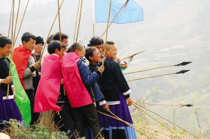 儀式當(dāng)天,各家各戶的父母給自家的孩子穿上新裝;孩子們則削木為刀,編草為穗,插玉米芯做矛頭,剝玉米皮當(dāng)纓槍,用竹籃背著用麻籽和燕麥炒制的干糧,從四面八方趕來,聚集在一起。