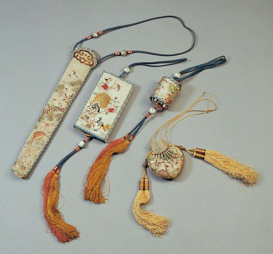 滿族服飾色彩多以淡雅的白色、藍(lán)紫色為主,紅、粉、淡黃、黑等色也是其服飾的常用色。白色在滿族服飾中是一個重要的顏色,因為,滿族傳統(tǒng)上有尚白習(xí)俗,以白色為潔、為貴,白色象征著吉祥如意,所以,在滿族服飾中常在紅色、藍(lán)色等其他顏色的旗袍上鑲白色的花邊。滿族男女都喜愛在腰間或衣服的大襟上掛佩飾。男子有火鐮、耳勺、牙簽、眼鏡盒、扇帶。滿族女子喜歡盤頭翅,梳兩把頭或旗髻,戴耳環(huán)、手鐲、戒指、頭簪、大絨花和鬢花等各種裝飾品。擅長刺繡,她們在衣襟、鞋面、香囊、荷包、枕頭等物品上刺繡花卉、芳草、鶴鹿、龍鳳等吉祥圖案(圖為滿族清代繡花湖色緞佩飾,中央民族大學(xué)民族博物館館藏)。