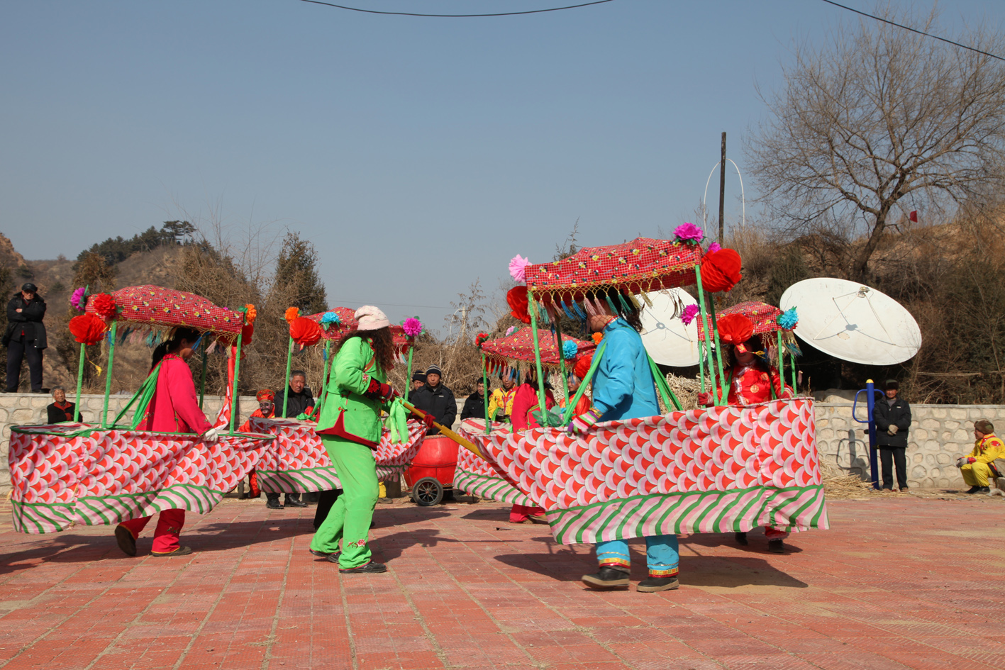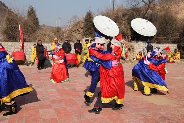 “二貴摔跤”,表演者實為一人,穿戴巧妙制成的道具,就可以扮演兩個扎小辮的頑皮兒童扭打摔跤。單人扮雙人摔跤,模仿得維妙維肖,一時難辨真假,風(fēng)趣幽默。