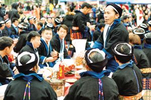 每逢重要節(jié)日,白褲瑤群眾都有舉辦長席宴的習(xí)俗。以前,芭蕉葉當(dāng)作盤子,芭芒干折成筷子,一個(gè)飯團(tuán)、一塊牛肉,再加一碗酒,就是長席宴的全部?,F(xiàn)在改變了很多,但不變的是白褲瑤自然、和諧、平等的美德。2019年2月拍攝。
