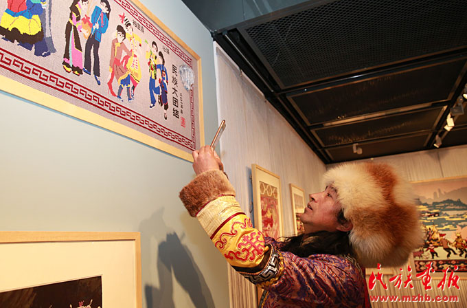 裕固族作家拿起手機(jī)拍攝《民族大團(tuán)結(jié)》織錦中的裕固族圖案