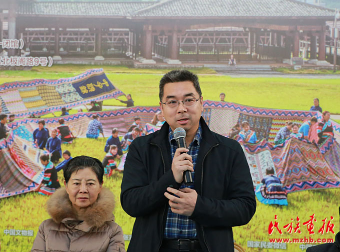 會(huì)上中國(guó)民族博物館黨委副書(shū)記、副館長(zhǎng)張志文向少數(shù)民族作家們介紹了展覽,他說(shuō):“土家族是一個(gè)歷史悠久的民族,現(xiàn)在有835萬(wàn)人口。土家織錦也有兩千多年的發(fā)展歷史,有250多種傳統(tǒng)圖案,是中國(guó)民間五大織錦之一,堪稱中國(guó)服飾文化中的奇葩。中國(guó)民族博物館從歷年征集收藏的300多幅清代以來(lái)的土家織錦中,選取了156幅精品土家織錦、21分鐘傳承人視頻和120余幅土家民族風(fēng)情照片。我們和中國(guó)婦女兒童博物館合作舉辦了這個(gè)高品質(zhì)的專題展,旨在傳承和弘揚(yáng)土家族國(guó)家級(jí)非物質(zhì)文化遺產(chǎn)?!?/p>