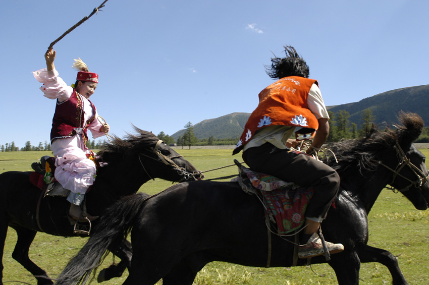 賽馬也是哈薩克人十分喜愛的一項傳統(tǒng)民族體育活動。賽馬分為賽走馬和賽奔馬兩種形式。賽走馬就是比馬的速度、耐力以及穩(wěn)健,騎手一般都是成年人。比賽時,不僅要使馬走得快、穩(wěn)、美,而且還不能使馬跑起來。賽奔馬就是比馬的速度和耐力,都是以先到達(dá)終點為勝。