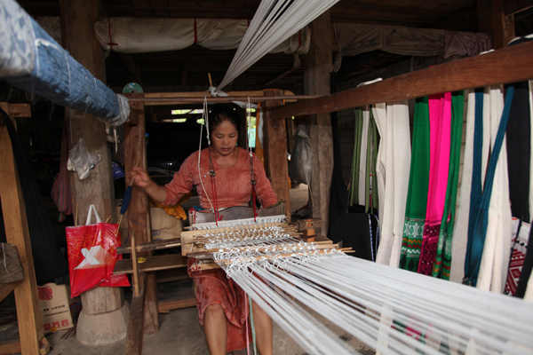 傣錦具有嚴(yán)格的制作工序。第一道工序?yàn)樯蠞{。傣錦所選用的材料為天然麻棉,上漿可以讓麻棉線的韌性加強(qiáng),不會(huì)起毛,這一步對(duì)以后織傣錦的過程有非常重要的影響。先將麻棉用專門調(diào)制好的米漿浸泡一天兩夜,再放到蒸籠蒸,蒸的時(shí)侯要注意不斷小心地翻動(dòng),以保證米漿完全均勻地浸入棉紗,令到棉線的粗細(xì)一致。第二步是曬棉紗。即把蒸好的棉紗放在太陽底下暴曬,在曬的過程中需要由專人隨時(shí)檢查,把結(jié)在一起的棉紗一根根分開來,這樣在紡線的時(shí)侯棉線才不會(huì)因?yàn)榫€粘在一起而斷掉。最后把曬好的線繞成線團(tuán)。第三步是拉經(jīng)線。拉經(jīng)線也是傣族織錦中非常重要的一道工序。在拉線的時(shí)候,所需要的場(chǎng)地非常大,因?yàn)榫€一拉一般都有八九十米長(zhǎng),為保持所有的線在拉的時(shí)候不會(huì)亂掉,只能在沒有太大的風(fēng)的天氣才能進(jìn)行,讓整個(gè)傣錦制作過程又增加了難度。在拉經(jīng)線的整個(gè)過程,都必須由有經(jīng)驗(yàn)的老藝人來組織,打樁,計(jì)算經(jīng)線的長(zhǎng)度,而且必須控制好在拉經(jīng)線的過程中棉線的松緊度。否則在織傣錦的時(shí)侯會(huì)有花紋傾斜,圖案錯(cuò)亂等問題。整個(gè)拉經(jīng)線的過程需要由7-8個(gè)老藝人一起來完成。第四步是編花和上機(jī)。傣錦是一種古老的手工紡織工藝,圖案的設(shè)計(jì)是通過熟練的紡織技巧創(chuàng)造出來的,多是單色面,用緯線起花,對(duì)花紋的組織非常嚴(yán)謹(jǐn),織造時(shí)傣族婦女將花紋用一根根細(xì)繩系在“紋板”(花木)上,用腳蹬手抬的動(dòng)作使經(jīng)緯形成上下兩層后開始投緯,如此反復(fù)循環(huán)便可織成十分漂亮的傣錦。設(shè)計(jì)一幅傣錦,需幾百乃至上千根細(xì)繩在“紋板”上表現(xiàn)出來,倘若結(jié)錯(cuò)一根細(xì)線,就會(huì)使整幅傣錦圖案錯(cuò)亂,可見傣錦的工藝要求極高。
