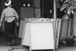 澆紙是在紙槽中進(jìn)行的,不但需要強(qiáng)勁的臂力,還需要相當(dāng)?shù)募?xì)心。在紙槽中舀水的時(shí)候,雙臂承受的重量不下10公斤,紙要澆得恰到好處,澆輕了紙就太薄,澆重了紙又太厚。太薄出不了好品相,太厚會(huì)增加成本。這是整個(gè)構(gòu)紙成品的關(guān)鍵,經(jīng)驗(yàn)老到的傣族老人,都不會(huì)在這道工序上馬虎。一雙手游走在澆紙槽,或輕輕拍打,或慢慢游弋,絮狀的纖維時(shí)而附著在手上,時(shí)而又歡呼雀躍地散開(kāi),頑皮得有點(diǎn)像芒團(tuán)村水塘邊遇上的那些孩子。憑感覺(jué)均勻了,老人這才輕輕將澆紙盤脫離水面,一眨眼功夫,一張構(gòu)紙便在盤上現(xiàn)出端倪。接下來(lái)的事就交給陽(yáng)光了,如果雨季來(lái)臨,構(gòu)紙就停止生產(chǎn)。所以說(shuō),芒團(tuán)構(gòu)紙常常浸漬著一種陽(yáng)光的味道。