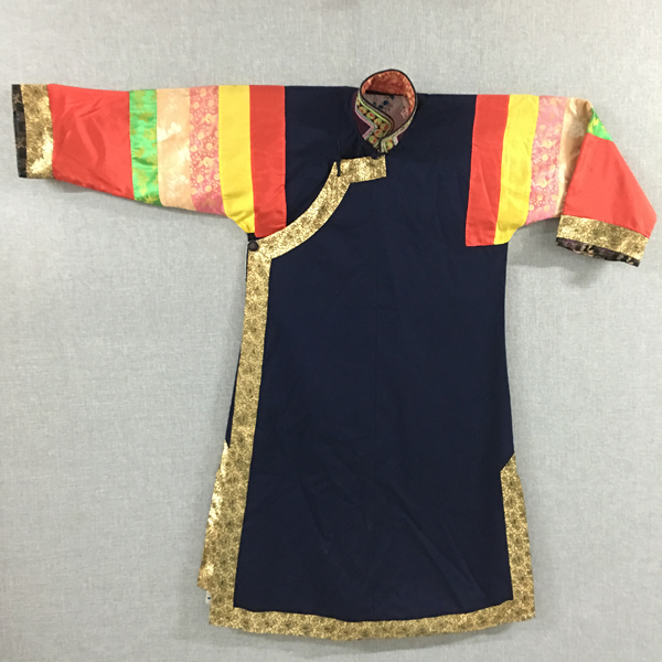 民族文化宮博物館收藏的這件立領(lǐng)右衽大襟五色袖“彩虹衣”,是土族女子盛裝時的一種服飾,征集于青海省互助土族自治縣。年代為20世紀30年代?!安屎缫隆遍L117厘米,胸圍120厘米,袖長59厘米,棉質(zhì)。整件女服右衽大襟,藍棉布襯里,左右側(cè)開衩,黑色“拉花”立領(lǐng),領(lǐng)上以土族傳統(tǒng)刺繡工藝—盤繡刺繡紅綠相間圓形圖案和辮形線條,綴三枚金色圓銅扣。衣袖為紅、黃、綠、白、粉五色彩布、彩緞拼接的“彩虹袖”,其中紅色為主色,占整個衣袖約一半面積,其余四色布塊相鄰,均勻分布于衣袖上方,布塊上刺繡有金色梅、蘭、竹、菊圖案。衣袖袖口鑲寬約3厘米黑色絲絨底刺繡花邊,花邊里外均繡有花草紋樣,做工精致?;ㄟ吷辖訉捈s10厘米金色牡丹紋花邊,與襟邊、下擺、衩口等處所貼金色牡丹紋花邊相互呼應(yīng),極富設(shè)計感。