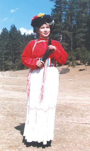 寧蒗地區(qū)的普米婦女多穿束腰、多褶的百褶裙,常用白藍(lán)等色的棉麻布制成,裙長(zhǎng)幾乎拖至腳面。活動(dòng)時(shí),她們將裙子從左面提起,掖在腰間。