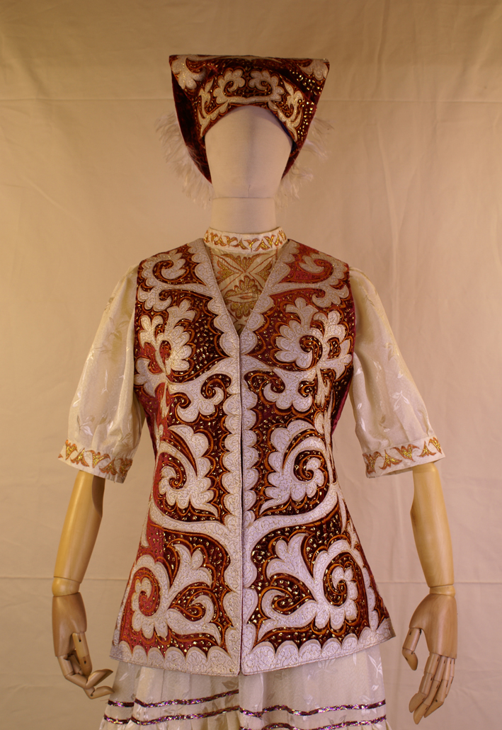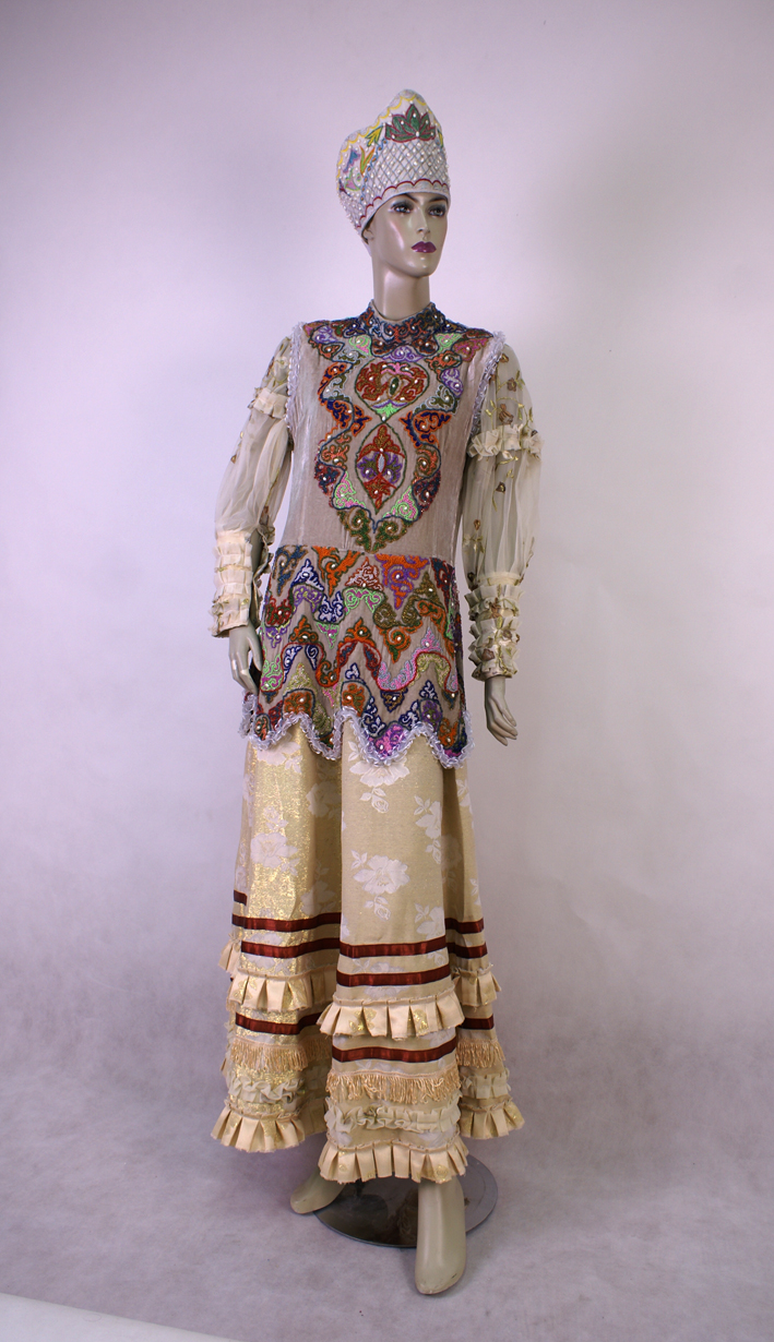 俄羅斯族女性的服飾則更多的體現(xiàn)了女性美,她們?cè)谥卮蠊?jié)慶或節(jié)日時(shí)會(huì)穿上絲綢質(zhì)地的繡花襯衣,外面再套穿一件無袖、腰身較高的對(duì)襟長(zhǎng)衫,下身一般穿著毛織長(zhǎng)裙。俄羅斯族女子也十分喜愛穿長(zhǎng)筒皮靴或氈靴。俄羅斯族女性的發(fā)飾也視年齡的不同而有所差異,少女梳獨(dú)辮,把彩色發(fā)帶和小玻璃球編在辮子里,頭發(fā)可外露。已婚婦女則梳兩條辮子,盤于頭頂,再用頭巾或帽子罩上。