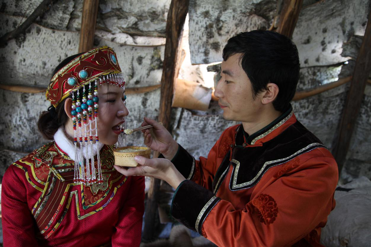 婚期來臨,男方同族兄弟姐妹組成聲勢浩大的接親馬隊(duì),簇?fù)碇吕汕巴降募依镉⑿履?。新娘進(jìn)入男方“烏力鄰”的時(shí)候,男方父母捧出美酒敬獻(xiàn)送親的新娘長輩,然后雙方的長輩被請到預(yù)先設(shè)置好的婚禮場地就坐,新郎新娘在主持人的引導(dǎo)下跪拜南天,新娘拜見公婆,新郎新娘跪拜所有長輩?;檠玳_始前,男方家長要向火神敬獻(xiàn)酒肉。婚宴中,新郎新娘吃肉要用一個(gè)盆盛,用一刀割,酒也要用一個(gè)碗喝,象征夫妻同甘共苦、永不分離。次日晨,新郎新娘要向出生的太陽磕頭祈禱,祈求太陽給他們溫暖,讓他們幸福。早餐后女方送親的人準(zhǔn)備返回,新郎新娘要向它們敬酒送別,祝他們一路平安。女方親友喝完餞行酒后,往往把酒杯揣入懷中,催馬疾馳而去,男方親友紛紛跨馬急追,想方設(shè)法將酒杯奪回來,否則認(rèn)為是男方無能。