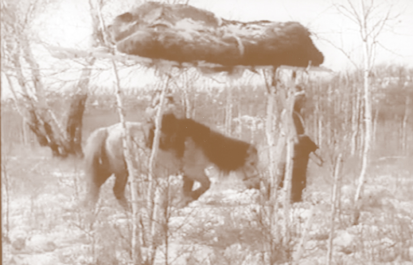 尸體入棺時(shí)不能見陽光,傳說尸體若見陽光,死者的靈魂就會(huì)從陰間返還陽間。死者入棺后,要把他生前用過的碗筷等餐具放在他左手旁,還有兩個(gè)敞著口的米、面口袋。右手旁放一些生產(chǎn)工具,男人放獵刀、弓箭等,女人放熟皮用具和針線盒等。