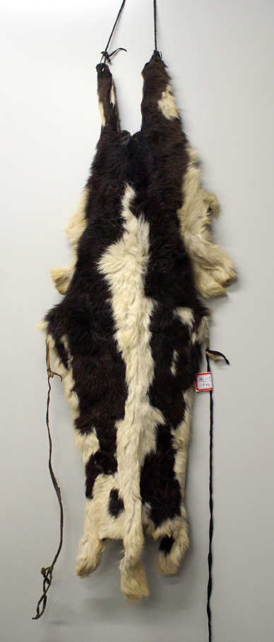 門隅南部地區(qū)的門巴族婦女,不分老少,袍服外披一張較為完整的小牛犢皮或巖羊皮,毛朝內(nèi)、皮板朝外,牛皮頸部朝上,尾部朝下,略做加工、而且四肢皮伸向兩側(cè)。以此為美飾,吉慶節(jié)日或訪親會(huì)友,都要披一張新牛皮做盛裝。傳說(shuō),唐代文成公主進(jìn)藏時(shí)背上披著皮子以避邪,后來(lái)此物賜給門隅婦女,后此物就成為門巴族婦女歷來(lái)沿用的裝束。