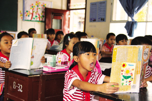基諾山民族小學(xué)的學(xué)生在課堂上朗讀課文。