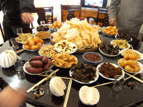 畬族人的副食多取之于山,蘑菇、竹筍、山藥、山野菜等大山中常見的野生植物,都被畬族人食用,而農閑時節(jié)畬族男子會上山打獵,以改善伙食。蔬菜主要有芥菜、白菜、卷心菜、蘿卜、水芹、茄子等,瓜豆類有南瓜、葫瓜、苦瓜、冬瓜、豇豆、豆角等。在水田里勞作時,還可以撿田螺、泥鰍、鱔魚等加餐。