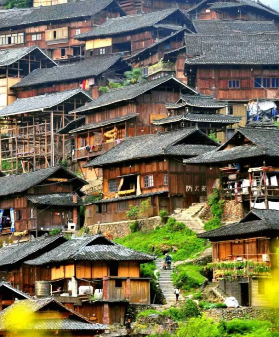 在雷山,苗寨吊腳樓依山而建,屋基開挖為上下二層,前檐柱或第二柱不落地,因此而得名吊腳樓,是苗族工匠們利用干欄式建筑在適應山地發(fā)展和變異的經典之作。