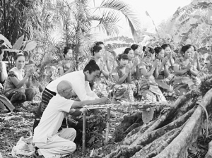 此外,人們還要定期對竜林舉行祭祀,以祈求來年風調(diào)雨順、五谷豐登、村寨安寧。如果有人破壞了竜林,整個村寨要舉行專門的祭祀,以示賠禮道歉,乞求祖先的寬恕。