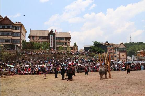 剽牛是佤族祈求神靈保佑,人們安居樂業(yè)、吉祥如意、幸福安康的一種傳統(tǒng)祭祀活動,同時他們也認為這是與神靈鬼魂溝通的最有效方式?!柏狻弊殖浞煮w現(xiàn)了剽悍、敏捷而勇猛的含義?,F(xiàn)在剽牛樁上已經(jīng)拴好了要舉行剽牛祭祀的水牛,各鄉(xiāng)鎮(zhèn)群眾已經(jīng)陸續(xù)就位,讓我們一起去領(lǐng)略佤族狂野的剽牛祭祀吧!