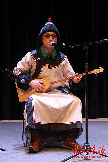 阿勒泰地區(qū)烏梁海突兀里傳承人巴特吐?tīng)柋硌荨稙踉泼细_(dá)森》。
