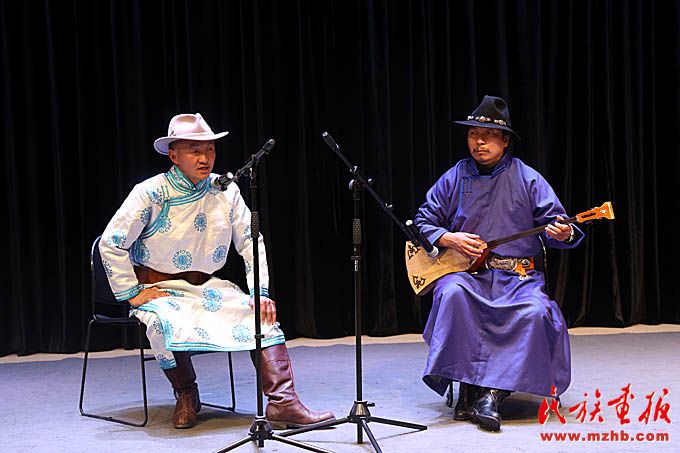 和布克賽爾蒙古自治縣江格爾傳承人(左)表演《江格爾說(shuō)唱》。
