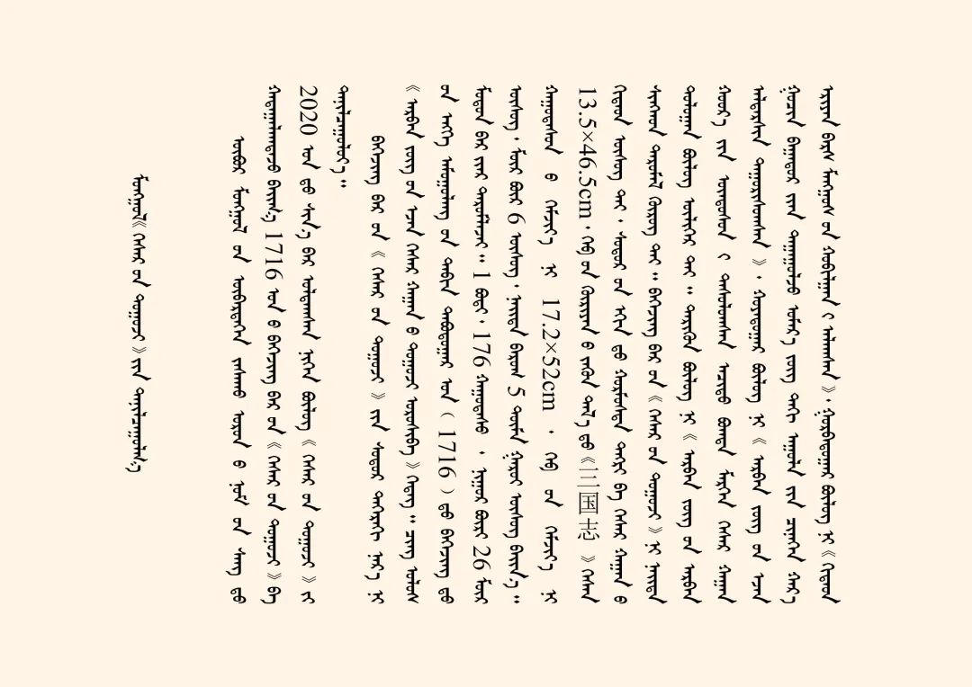 今天我們主要講述的是1716年北京木刻本蒙古文《格斯?fàn)杺鳌罚ㄈQ為《十方圣主格斯?fàn)柨珊箓鳌罚┦乔蹇滴跷迨迥辏?716)北京木刻本。梵夾裝,1卷(176葉),每頁26行,每行6個字,約5萬多字,頁面高17.2cm、寬52cm,版框高13.5cm、寬46.5cm。版框左側(cè)有漢文《三國志》三字,首頁刻有朱印佛像。