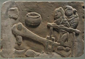 長28厘米,寬19厘米,厚5厘米。出土?xí)r嵌于古墓左室右壁券門下部一側(cè),夫婦二人,雙手扶欄桿、腳踏碓桿。男子著翻領(lǐng)左衽長衣,前襟掖起,系在腰帶上。婦女高髻,著短衣長裙,身背嬰孩,身子前傾,費(fèi)力地踏著碓桿,和丈夫一起舂米。碓桿的另一端裝著一塊石頭,懸在空中,垂直下方放置著一個(gè)石臼,石臼附近有籮、簸箕等生活用具,生動地反映出勞動人民的日常生活。