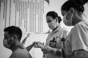 醫(yī)務(wù)人員用蒙醫(yī)傳統(tǒng)療法——火針,為群眾治療。新華社記者 彭源攝