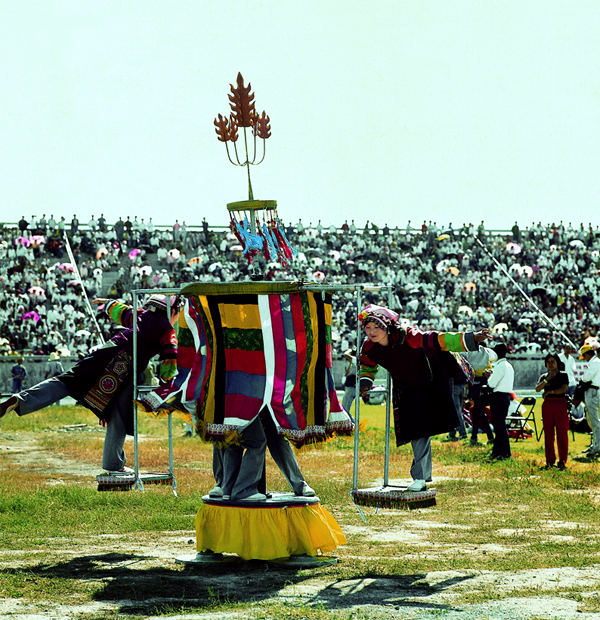 輪子秋,土語(yǔ)稱(chēng)“卜日熱”,是土族人在農(nóng)閑時(shí)舉行的一種體育活動(dòng),主要在青?;ブ磷逡粠Я餍?。每年冬季碾完場(chǎng)后,特別是春節(jié)期間,人們?cè)谄秸麑挸ǖ柠湀?chǎng)或其他可以利用的場(chǎng)地上,把馬拉大車(chē)的車(chē)棚卸下來(lái),將輪和軸整體豎起,然后將抵在地上的輪上壓上石頭等重物,固定重心。隨后,在上面的輪子上橫著綁一架三四米長(zhǎng)的梯子,兩端各綁一個(gè)U形的秋千坐套。人坐在坐套內(nèi),由他人推動(dòng)轉(zhuǎn)圈?,F(xiàn)在許多土族村莊,每年還要舉行輪子秋比賽。比賽時(shí),兩人各坐于座套上,然后推動(dòng)木梯,使之快速轉(zhuǎn)動(dòng)。參賽者可表演“雄鷹展翅”“金雞獨(dú)立”“孔雀開(kāi)屏”“猛虎下山”“金鐘倒掛”“蛟龍出?!钡润@險(xiǎn)的高難度空中動(dòng)作。比賽常以轉(zhuǎn)時(shí)長(zhǎng)、頭不暈、眼不花、站立較穩(wěn)當(dāng)?shù)霓D(zhuǎn)秋者為優(yōu)勝者。近年來(lái),輪子秋已被列為全國(guó)農(nóng)民運(yùn)動(dòng)會(huì)和民族運(yùn)動(dòng)會(huì)的表演或比賽項(xiàng)目。輪子秋也得到改進(jìn),現(xiàn)多用鋼管為原料焊接,還裝上了滾珠軸承,使用更加安全。
