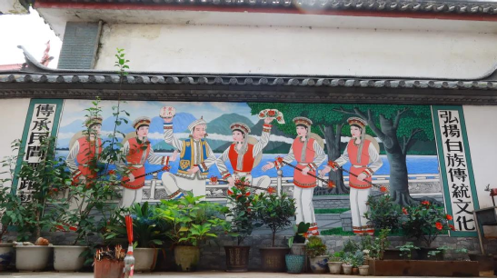 方正的堂屋里掛滿了何松康參加演出、培訓(xùn)的各種照片及霸王鞭、八角鼓、服裝等演出道具。院子的墻上專門請(qǐng)人繪了一幅霸王鞭的彩繪,旁邊書寫:“弘揚(yáng)白族傳統(tǒng)文化,傳承民間舞蹈藝術(shù)”。