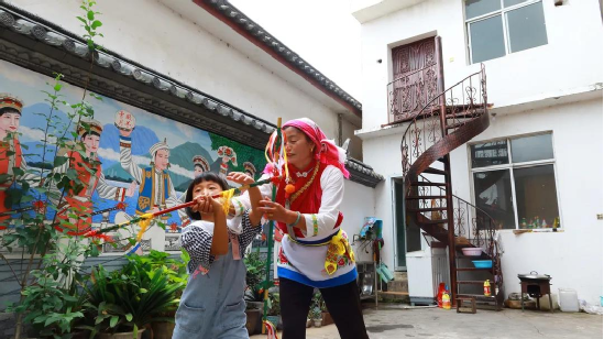 整個(gè)慶洞村世世代代都有打霸王鞭的習(xí)慣,何松康老師向我們介紹:“霸王鞭是古時(shí)白族人民在田間勞作過程中演變而成的舞蹈,舞蹈的手帕好比勞作時(shí)擦汗的手巾,霸王鞭好比勞作時(shí)手中的鋤頭,這舞蹈來源于天地間,是勞動(dòng)人民的智慧結(jié)晶”。而何松康所舞的霸王鞭是最傳統(tǒng)的樣式,是由爺爺傳承給媽媽,再由媽媽傳承給自己的。如今,她又將其完完整整傳給了自己的兒媳婦及小孫女?!拔易约合矚g打,家里的人也喜歡,幾代人都打霸王鞭,我勵(lì)志要好好地傳下去”,何松康說。