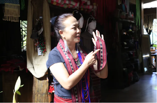 娜紅是勐梭鎮(zhèn)他朗村十組的老婦女主任,十多歲起開始學(xué)習(xí)佤族織錦技藝,隨后加入了李憲蘭工作室。“我靠織佤錦為家里織出了兩層樓房?!蹦燃t感恩佤錦技藝為家里帶來的改變,從前是白天勞動,晚上織布,一年只能賣得2000元?,F(xiàn)在,每個月可以拿到3000元工資,年底還有分紅,日子越來越有盼頭。