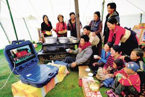 四川省甘孜州甘孜縣卡龍鄉(xiāng)卡龍村的牧民們高興地在新型帳篷中通過移動(dòng)電視收看節(jié)目。尹鋼攝