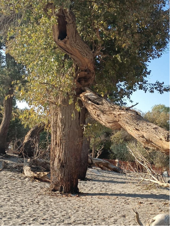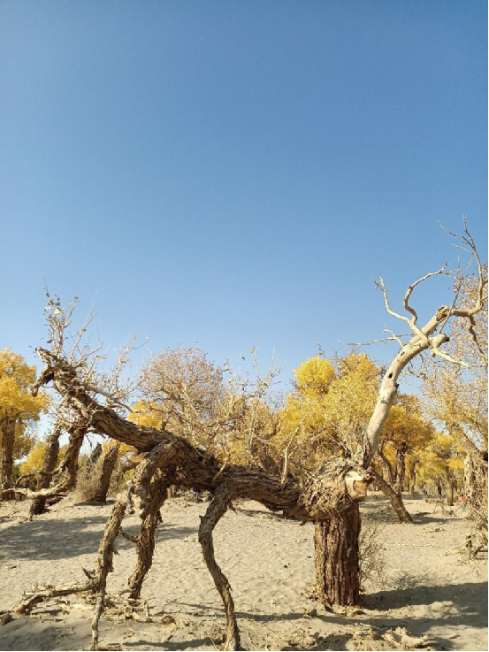 每當(dāng)深秋季節(jié),胡楊樹葉變得一片金黃,形成胡楊秋色,樹影婆娑,奇妙絕倫,賞心悅目。漫步在濃郁的胡楊林中仿佛進(jìn)入神話般的仙境。茂密的胡楊千奇百怪,神態(tài)萬般。粗壯的幾人難以合抱,挺拔的七、八丈之高,怪異的似蒼龍騰越,似虬蟠狂舞,令人驚奇不已,嘆為觀止。僅就密密匝匝的樹葉,也是風(fēng)采獨(dú)有。幼小的胡楊,葉片狹長而細(xì)小,宛若少女嫵媚的柳眉,人們常常把它誤認(rèn)為柳樹;壯齡的胡楊,葉片又變成卵形、闊卵形或三角形,猶如興安嶺的白樺;進(jìn)入老年期的胡楊,葉片才定型為橢圓形。更令人稱奇者,在同一棵胡楊樹冠的上下層次,還長著不同形狀的葉片,因此,又稱“異葉楊”